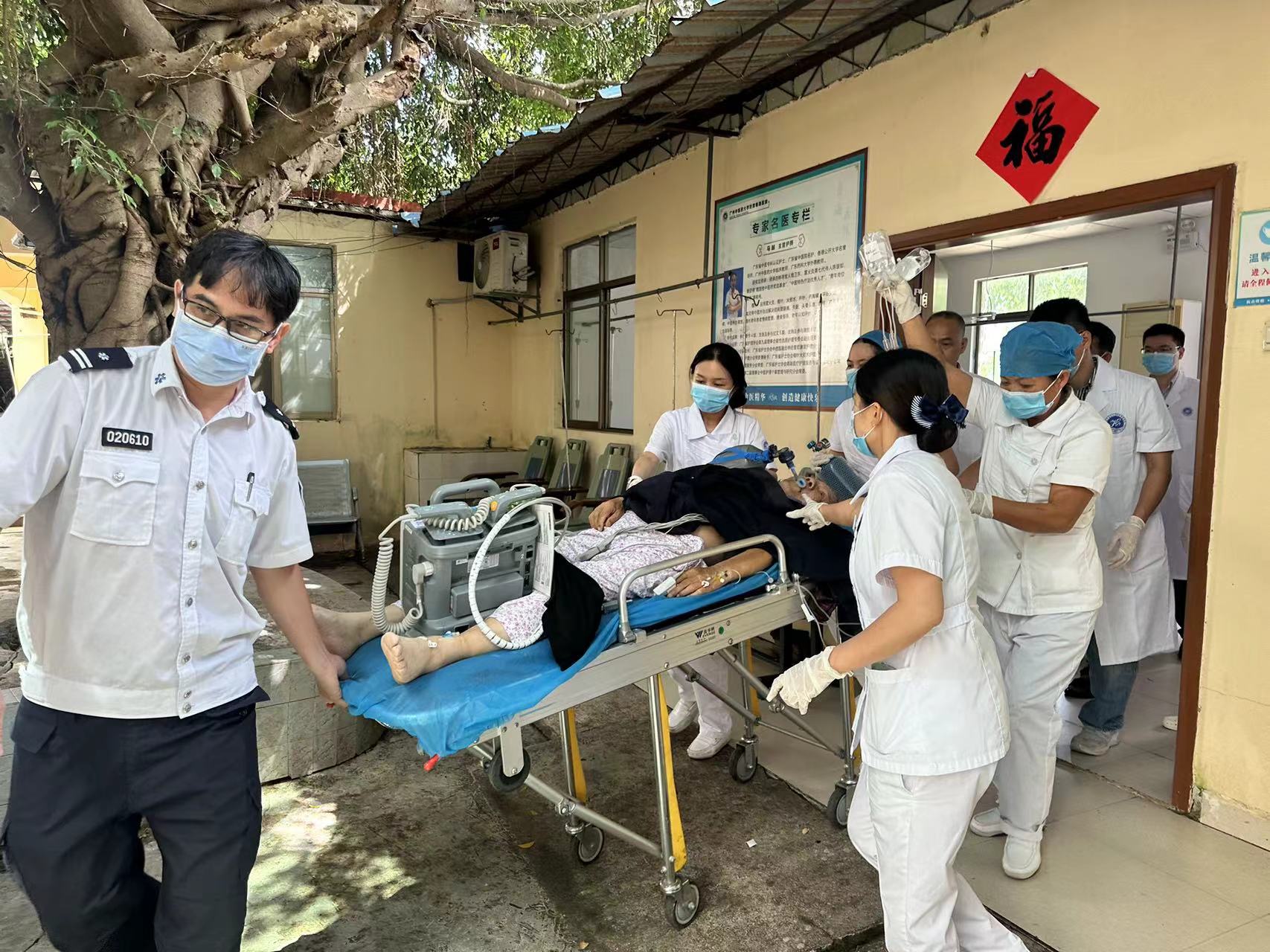听到这样的呼声,立即触动医护人员最敏感的神经,迅速把患者接到抢救室,只见患者已无呼吸心跳,瞳孔散大,大动脉搏动消失,意识丧失,全无生命征象!医护人员们立即启动抢救程序,通知粤海医院帮扶专家到达现场指导抢救,同时紧张有序进行胸外按压,气管插管,球囊辅助呼吸,积极吸痰,开通静脉通道,药物强心升压等竭尽一切措施,每一步抢救没有最快只有更快,展开了一场与死神的殊死搏斗!
